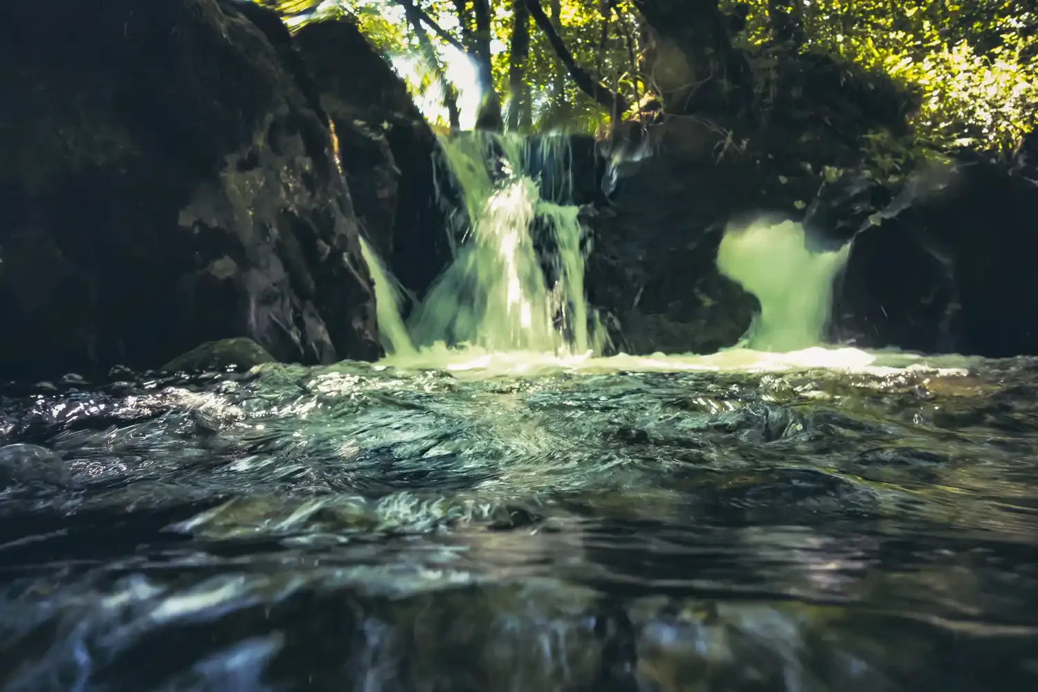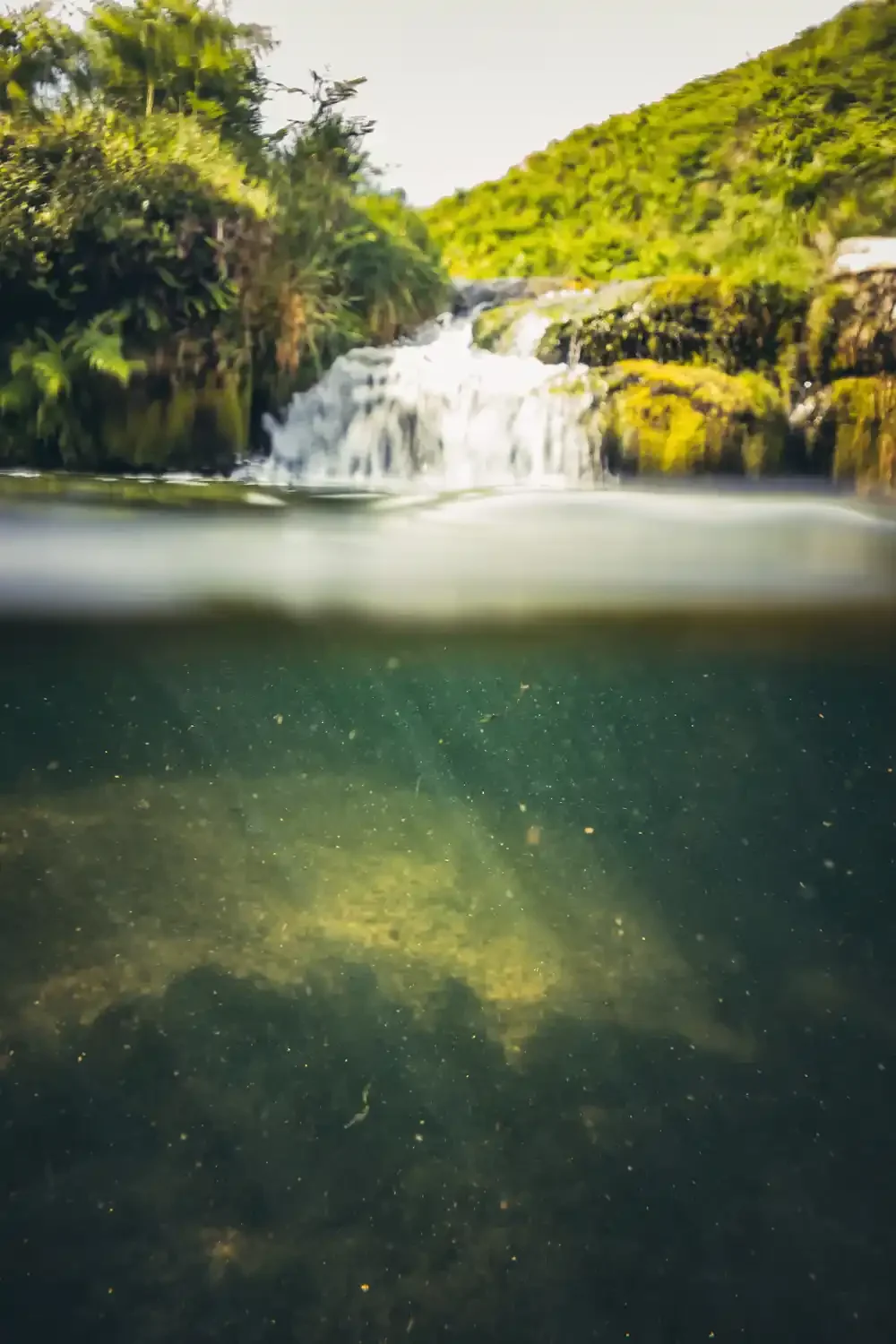 A small cascade becomes a roaring wall of white and silver threads once you’re looking up through it. Merely shooting with longer exposures underwater completely changes what you capture.
